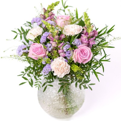 Søt bukett med lyse lilla løvemunn, lyse lilla limonium, rosa rose, kremfarget nellik, thlapsi og sesongens luftige grønt. Perfekt til bursdager, viktige jubileer og alle andre anledninger du ønsker å feire. Buketten er et eksklusivt blomsterhåndverk, og blomstene er nøye utvalgt for å holde høy kvalitet. Hver bukett er unik og bindes etter tilgjengelig sortiment og sesong – men beholder alltid sin farge og form. Buketten leveres av en lokal blomsterhandler.